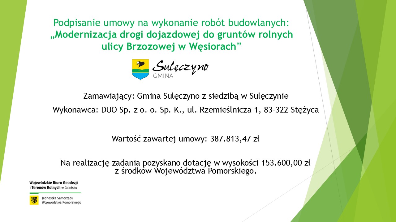 W dniu 19.09.2025 r. Wójt Gminy Sulęczyno zawarł umowę na wykonanie zadania pn. Modernizacja odcinka drogi gminnej nr 166042G ulicy Brzozowej w Węsiorach.